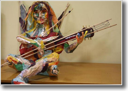 sculpture de grillage, papier, baguettes de bois et fils de coton, d'environ 70 cm de haut et 1 m de large. Ses doigts de pianiste effleurent les fils d'un instrument enchanté.